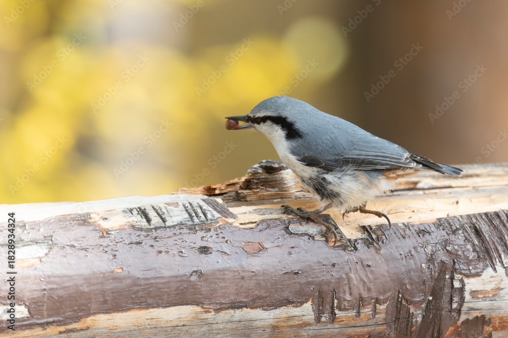 A nuthatch pecks sunflower seeds while sitting on a stump, close-up