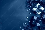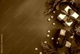 Christmas background with gift boxes with red ribbons, green pine branches, and golden stars on red surface. Perfect for holiday cards, banners, and festive ads.