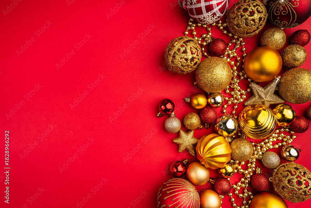 Gold and red Christmas ornaments with glitter stars on a red background. Ideal for festive greeting cards, holiday banners, seasonal invitations, and Christmas promotions.
