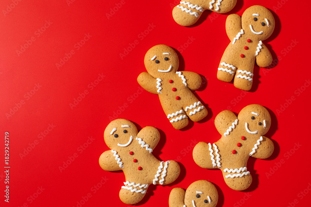 Christmas gingerbread cookies on red backdrop. Cozy winter mood. Christmas and New Year. Copy space