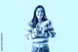 Young woman with credit card on pink background