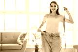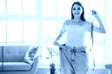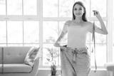 Beautiful young woman in loose jeans with measuring tape at living room. Weight loss concept