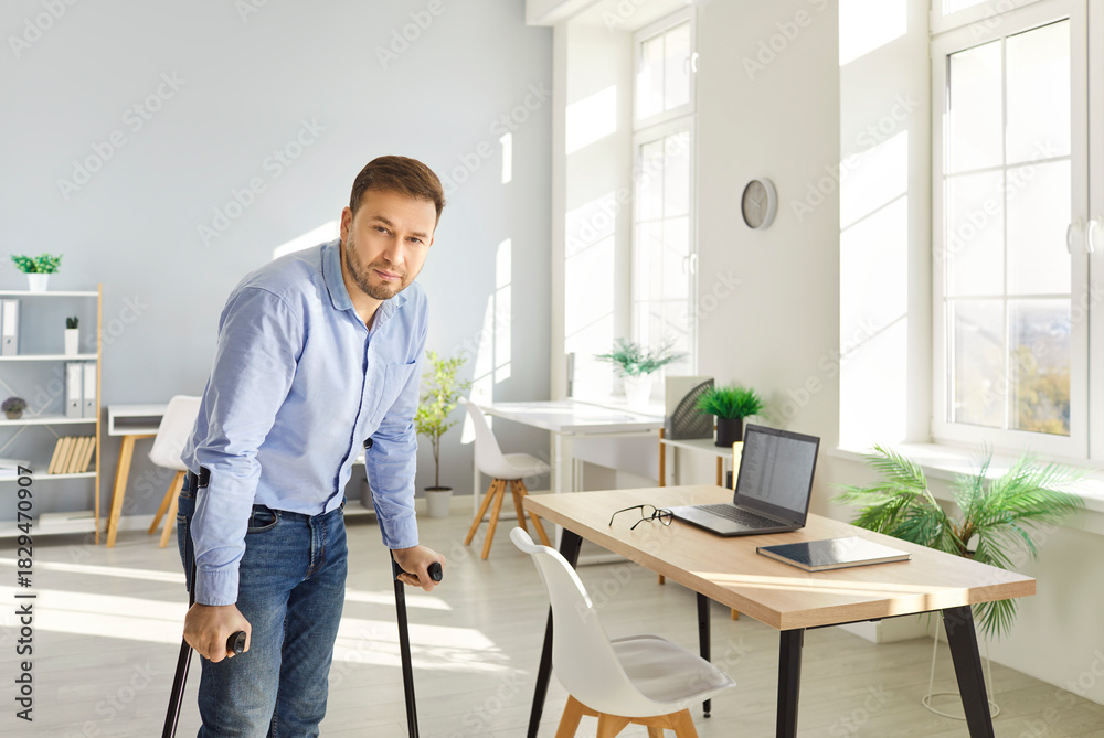 Portrait of confident man with crutches standing in bright modern office. Young professional recovering from foot trauma, resuming work, showing determination and resilience in overcoming challenges.