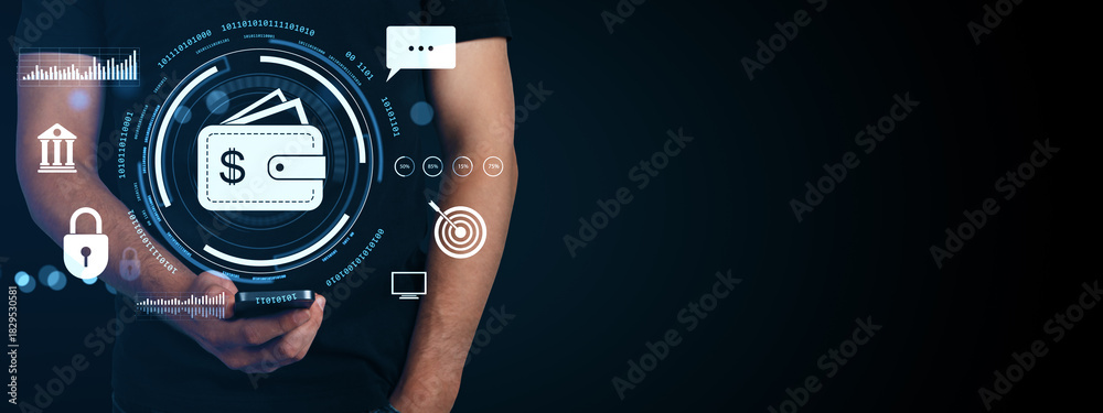 Digital wallet interface concept with smartphone and user showing financial and blockchain icons on abstract background in futuristic style.