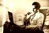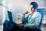 Business professional analyzing digital document management system with neon workflow icons on screen in modern office environment.