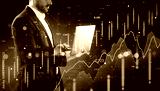 Businessman analyzing forex and financial market data on laptop with digital stock charts and currency graphs on blue background concept.
