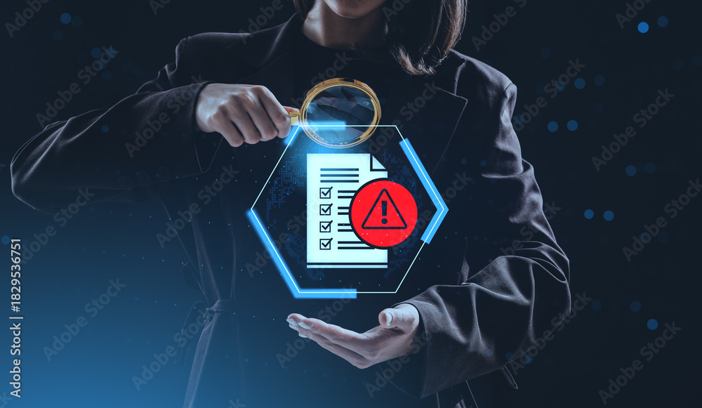 Businesswoman analyzing checklist with warning symbol using magn