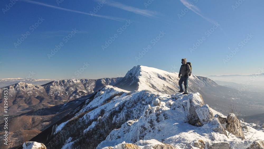 Lonely mountaineer get rest on snowy mountain high above the clouds into the sun