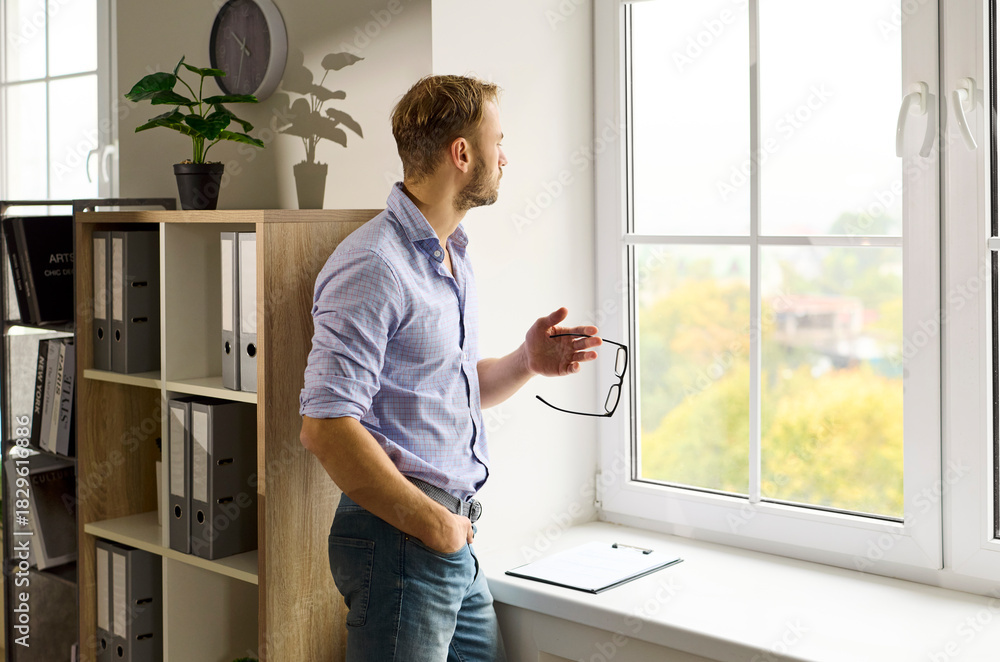 Serious man thinking by window. In modern office room, the pensive professional employee looks out, weighing business choices and plans under sunlight. Clear idea thoughtful decision making.