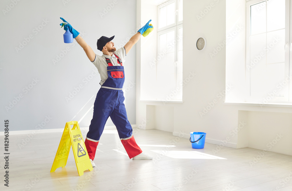 Portrait of happy smiling male young janitor in uniform having fun in empty apartments holding detergent in hands. Cheerful man cleaner washing room or office. Cleaning service concept.