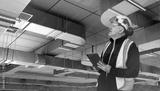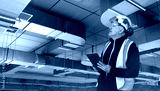 Building inspection specialist evaluates ceiling ventilation systems using a digital tablet, checking structural elements and airflow components in an industrial facility.