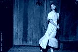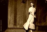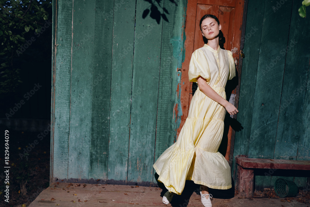 Portrait of a woman model in a flowing yellow dress stands by a weathered doorway in an outdoor night setting, striking a poised pose and glancing back, exuding elegant fashion and moody cinematic
