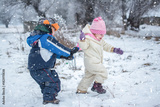 Little boy and girl playing together on snowy day in winter park.