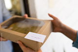 Neighbor receiving homemade dessert box with from your neighbor note, expressing kindness and community