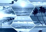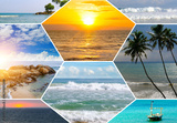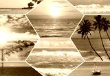Tropical Beach Scenes Collage: Sunset, Waves, and Palm Trees