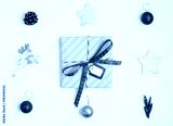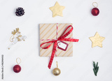 Flat lay top view Christmas minimalistic geometric composition. Gift, christmas decoration, fir branches, gold stars, pine cones. New year concept