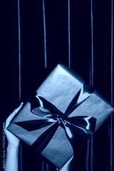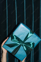 Woman's hands holding blue gift box behind green velvet curtain