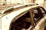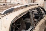 A car damaged by a blast wave from a drone strike near a residential building during the war
