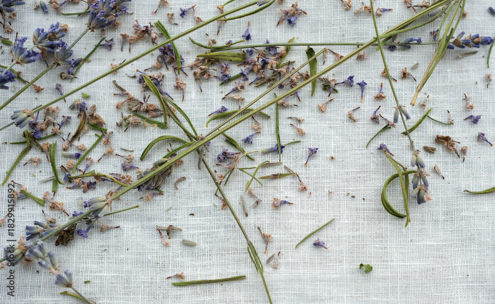 Dry lavender flowers on white textured linen cloth. Calming and aromatic photo.