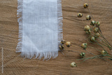 An empty white linen label and dry flax pods on a wooden background. Mock up. Copy space.