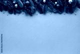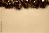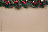 Christmas background for festive greeting card with fir branches, red berries and shiny decorations on beige table top view.