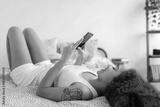 Young woman lying on a cozy bed, smiling while using her mobile phone, enjoying a peaceful morning of leisure and connection at home