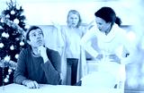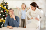 Elderly mother and woman during family quarrel accuse adult man during winter holiday, prove his wrong, conflict of interest