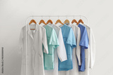 Rack with medical uniform on light background