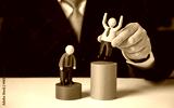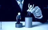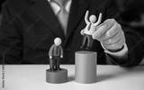 The businessman marks the winner and promotes him. Career advancement, employee recognition and merit based rewards. HR motivation , leadership training and corporate success stories.