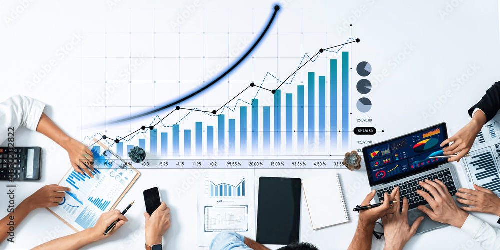 A dynamic scene of business professionals analyzing financial data with various charts and technology, highlighting teamwork and strategic planning for growth. Scalp