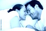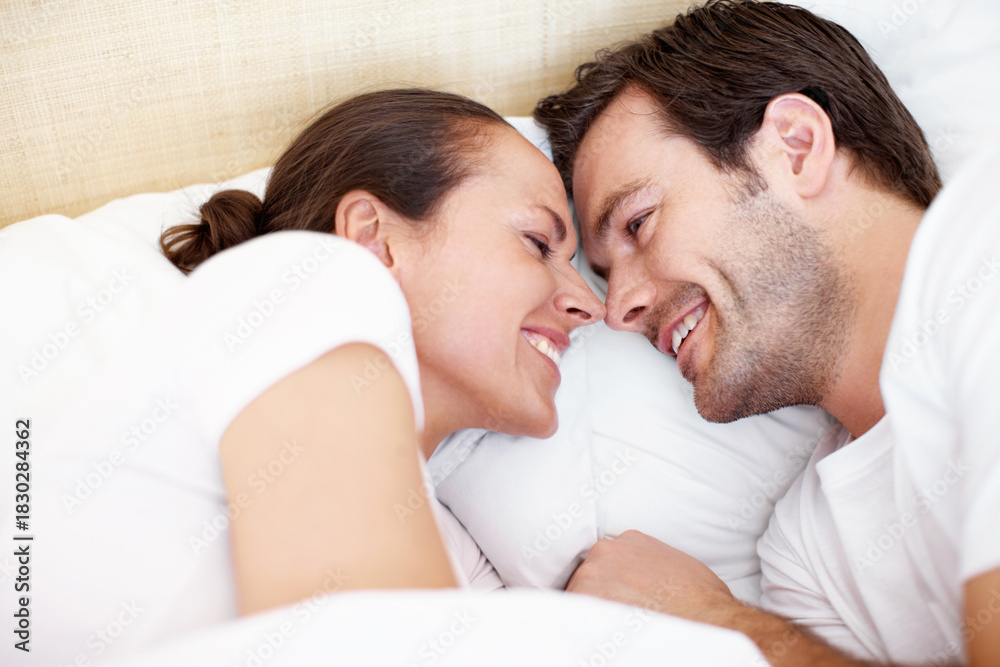 Wakeup, happy and above of couple in bed for resting, comfortable and bonding in morning. Love, bedroom and man with woman together for connection, healthy relationship and relax on weekend in home