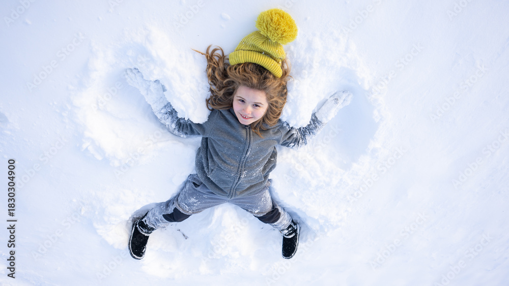 Child lying in snow making angel wings shape. Angel kid play in winter. Winter fun with a happy child making snow angels.