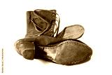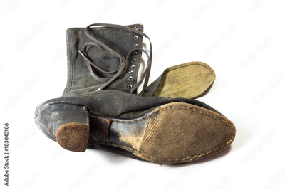 Detail view of a very old cloth and leather woman's high lace shoe, view from sole, isolated on white, horizontal aspect