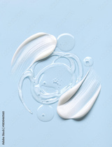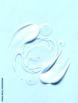 samples of cosmetic care products smear of cream and gel texture on a light blue background, moisturizing and skin care concept