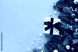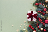 Golden gift or present box with velvet red ribbon with festive decoration on green background for Christmas or New Year greeting card