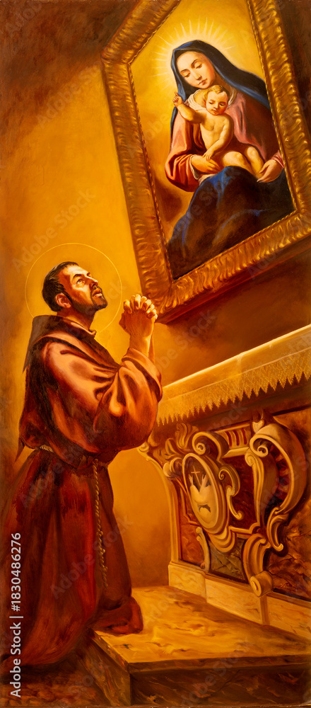 CAVA DE TIRRENI, ITALY - OCTOBER 7, 2025: The painting of St. Diego at the prayer before image of Madonna in the church Chiesa di San Francesco e Sant Antonio by A. Dubinin (2009)