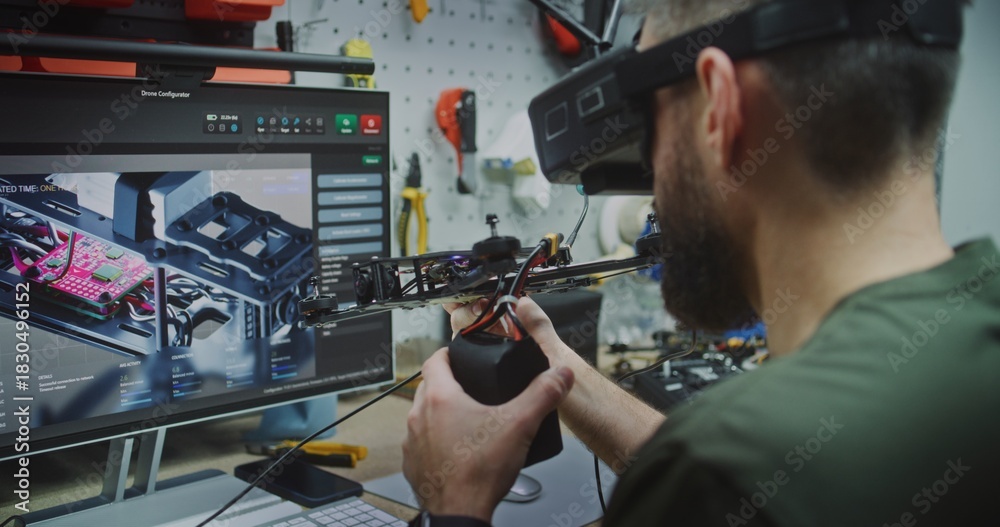Pre Flight Validation Engineer Testing and Adjusting Drone Performance Parameters. Man Actively Testing Drone Performance Parameters. Concept Critical Pre Flight Validation Process in Specialized Lab.