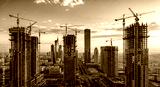 Panoramic view of city construction site with cranes building new skyscrapers at sunset urban development real estate investment architecture growth industry