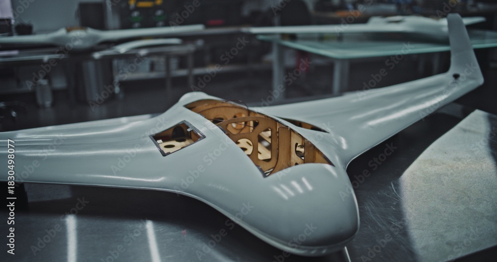 Close Up of Large UAV Open Fuselage, Revealing Lightweight Internal Structure. Composite Structure Internal Frame of Fixed Wing Surveillance Drone. Concept Drone Engineering and Material Design.