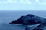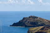 Coastal view of far end of Ponta de Sao Lourenco Madeira with lighthouse, revealing rugged rocky slopes meeting bright open ocean under clear sky