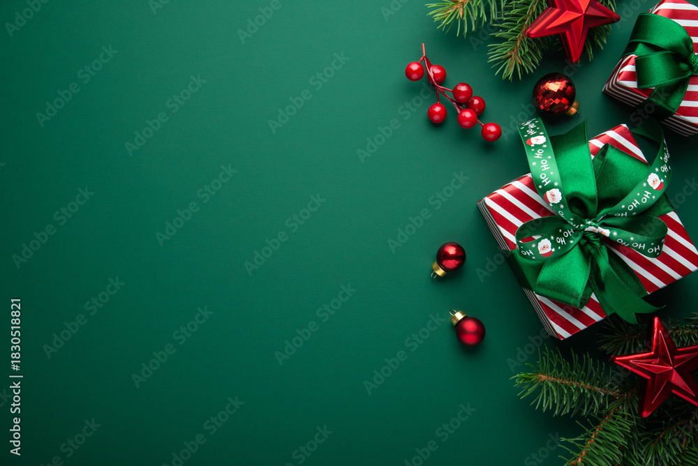 Merry Christmas and Happy Holidays greeting card, frame, border. New Year. Red Christmas ornaments and gifts, presents on green background top view. Xmas holiday festive theme. Christmas decoration