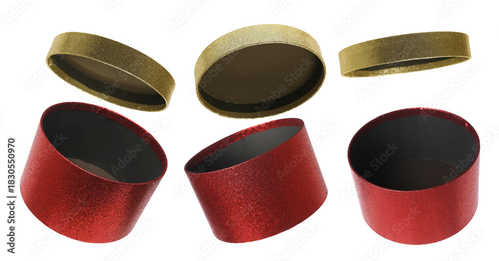Мagic box, set blank open gift, present red golden pack with lid flying, isolated on white background, clipping pat