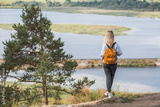 A woman with a backpack on a rocky mountaintop at the edge of a cliff, overlooking a forest and a lake.A hiker on a mountaintop.