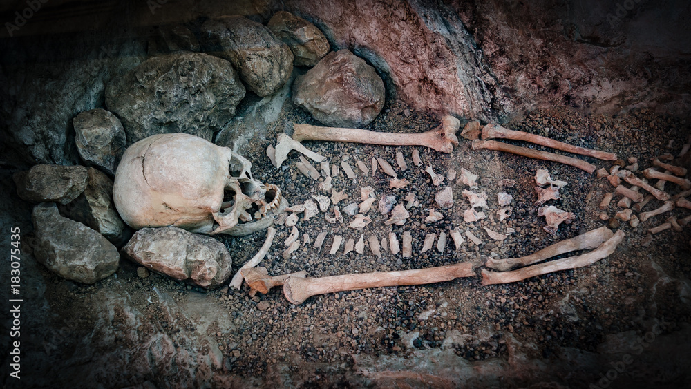 Skeleton of a primitive man inside a cave.
