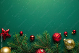 Christmas background with xmas tree, Christmas red golden ornament and snow lights on green background. Merry Christmas greeting card. Winter holiday theme. Happy New Year. Xmas decoration