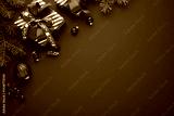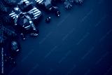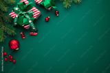 Merry Christmas and Happy Holidays greeting card, frame, border. New Year. Red Christmas ornaments and gifts, presents on green background top view. Xmas holiday festive theme. Christmas decoration