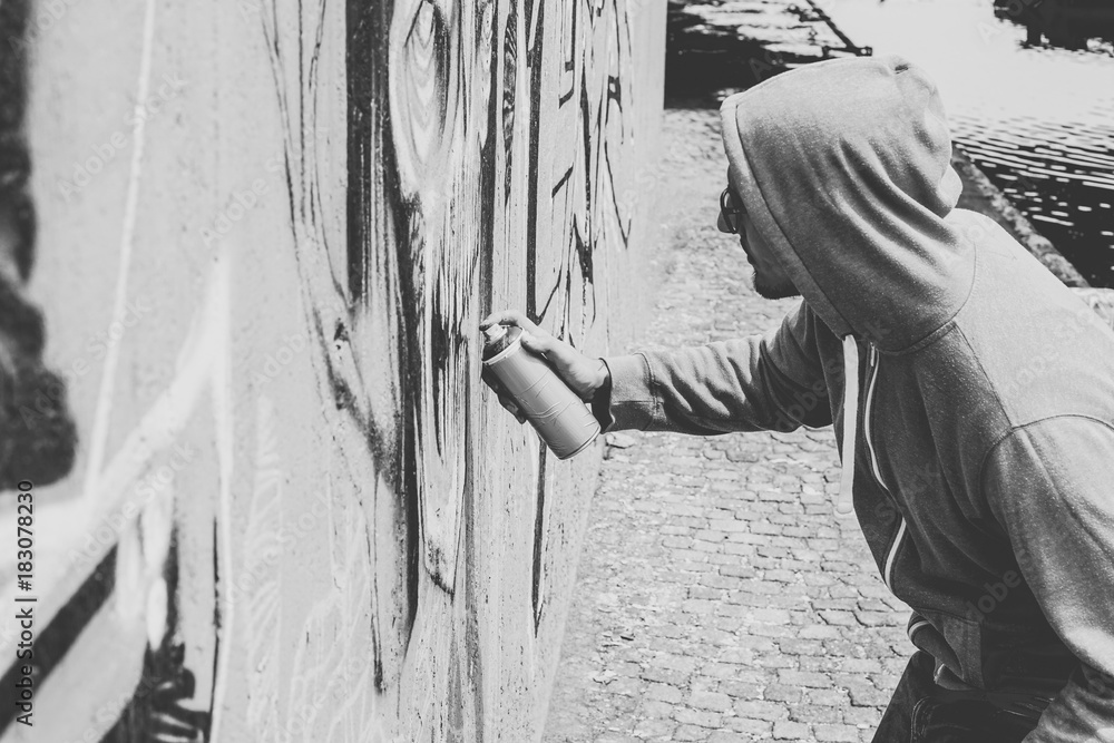 Street graffiti artist painting with a color spray can a graffiti mural on the wall - Urban, lifestyle, street art concept - Black and white edit