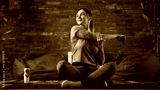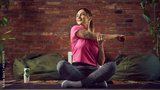 Woman stretching during home workout in warm living room atmosphere. Concept of fitness lifestyle, wellbeing promotion, healthy routines, sport branding, and personal wellness content.
