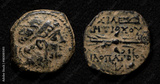 Ancient coin of Antiochus IX, king of Seleucid Empire, inscription King Philopator on Greek and thunderbolt on revers, vintage bronze textured money