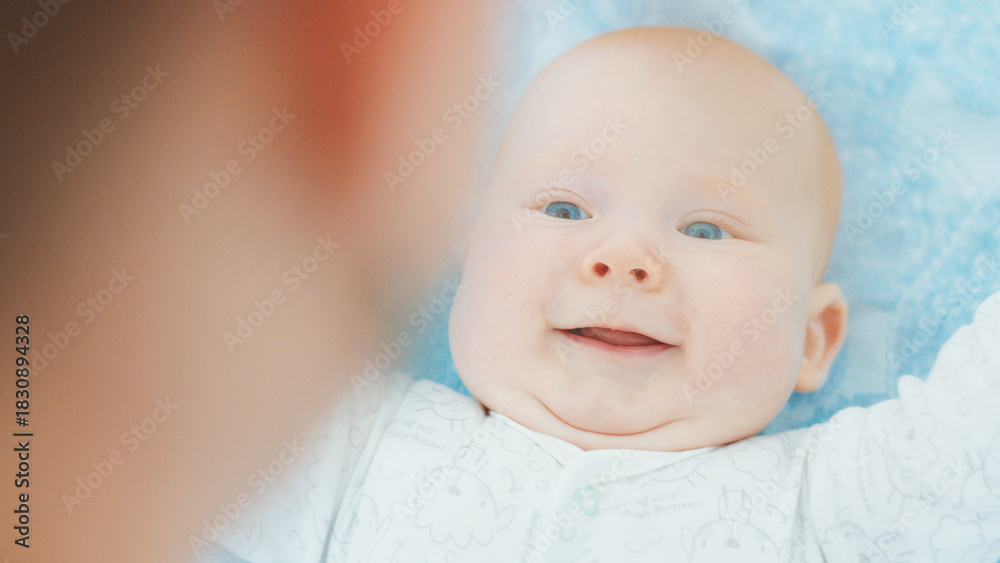 Mother plays with her newborn son with deep blue eyes in a bright room